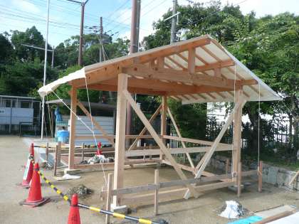 市教委の「学校ふれあいパーク事業」として本校では,運動場の南西に東屋を作っていますが,現在写真のように柱が立ち屋根もできてきています。