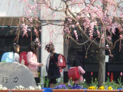 校門正面に見えるしだれ桜も見事に開花し,チューリップやパンジーと調和して春爛漫の風景です。登校してきた子どもたちも,春の空気を感じています。