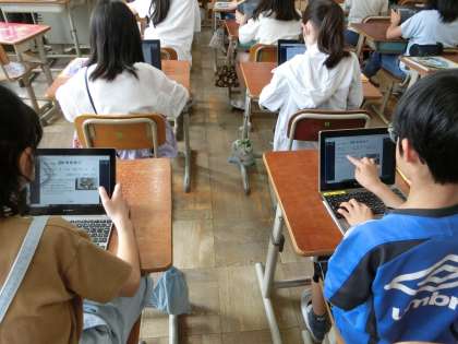 4年生の教室では、理科の学習で、GIGA端末を使って、一人一人の子どもが、観察した植物についてカードにまとめる活動をしました。自分で撮った写真を使ってわかりやすくまとめていきます。端末の使い方にも慣れていて、スラスラと使いこなしていました。