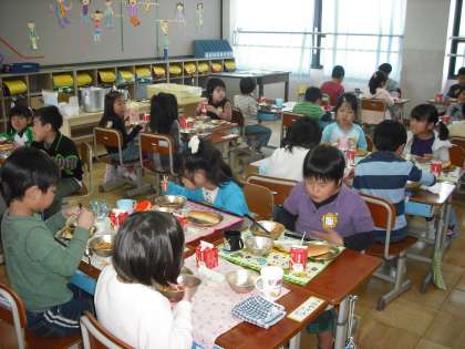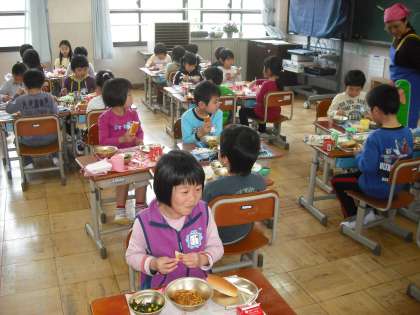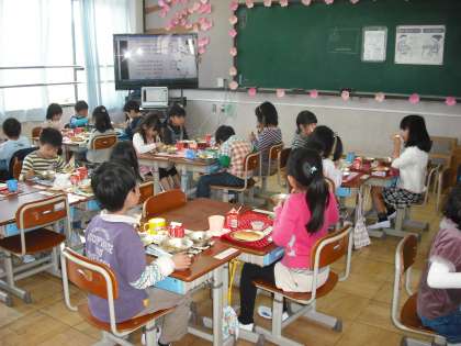 今日から給食がはじまりました。1年生にとって初めての給食メニューは,スパゲッティとほうれん草のソティです。「おいしそう。」「早く食べたいなあ。」と言う声が上がっていました。お家でも,たくさんお話をしていることでしょう。