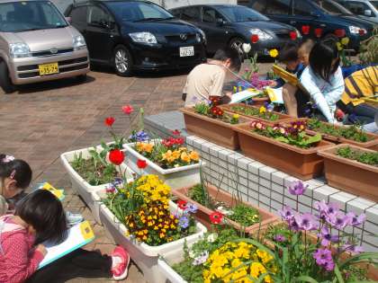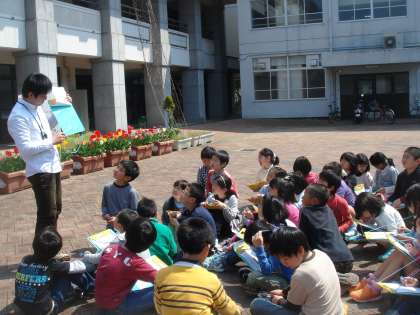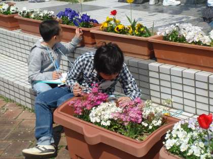 春うららの日,3年から始まった理科の学習で花の観察をしました。前庭に咲いているしだれ桜やチューリップ・パンジーなど,思い思いの花を観察していました。