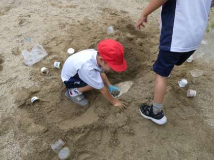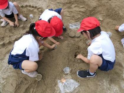 運動場の砂場で砂や土に触れて感触を捉え、思い付いたことを楽しんで試す活動をしました。大きな穴を掘っている子やプリンカップで作った形をきれいに並べている子、友達と山を作ってトンネルを作っている子など思い思いに楽しみました。