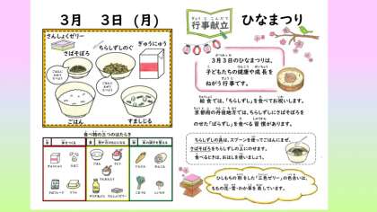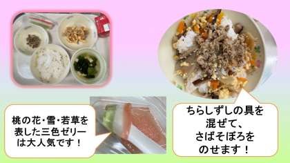 この日の給食は、ひなまつりの行事献立です。子どもたちの成長を祈って、給食調理員が心を込めておいしく作り上げました。