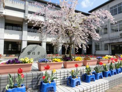 これから始まる学校生活がよりよいものになるようにと、春休みの間、教職員みんなで準備してきました。前庭の花もきれいに咲きそろって、みなさんが登校するのを待っています。元気に登校してくださいね!、