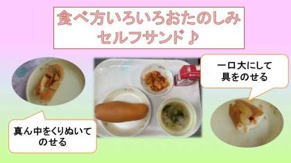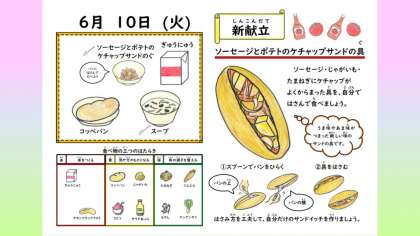 ソーセージとポテトのケチャップサンドは、新しい献立でした。具を自分でパンに工夫してサンドイッチにして味わいます。1年生も上手に挟んでおいしく味わえていました。