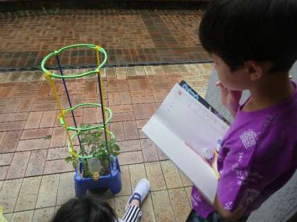 国語科「かんさつ名人になろう」の学習を進めています。今日は、自分のミニトマトをじっくり丁寧に観察し、見つけたことや気づいたことをノートにメモしました。メモした後、ぺアで伝え合い、その後、良いメモの書き方や観察の視点を全体で交流しました。