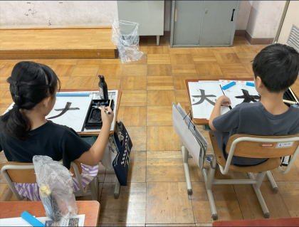 書写の学習で「大」を書きました。子どもたちは、はらいの筆遣いに気を付けて、筆圧を確かめながら書くことができました。また、小筆で文字のバランスを意識しながら名前を書くことができました。