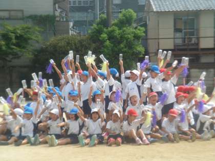 3年生は運動会で,「島唄」の音楽が流れる中,エイサーを踊ります。ペットボトルをたたきながらゆったりした,それでいて沖縄民謡の力強さも感じます。みんなで合わせる心地よさがだんだん動きに表われてきました。