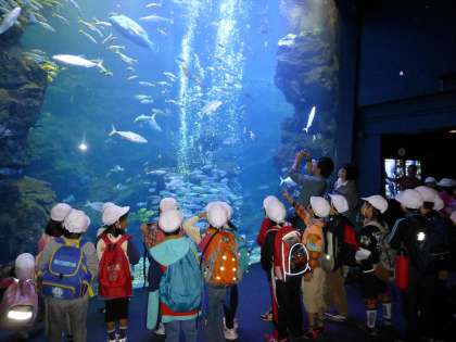 また,大水槽の前でいろいろな魚が泳いでいるところに