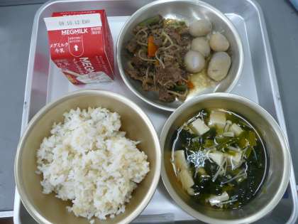 きょうの献立は「玄米ごはん・牛乳・牛肉のしぐれ煮・さといもの煮つけ・すまし汁」でした。明日(3日)は十五夜です。「いも名月」と呼ばれるようにさといもの収穫の時期で,さといも・枝豆・だんごなどをお供えします。給食でも月見献立として「さといもの煮つけ」を出しています。すまし汁は,とうふ・えのきだけ・ほうれん草を具に入れました。玄米ごはんもしっかりと食べていました。