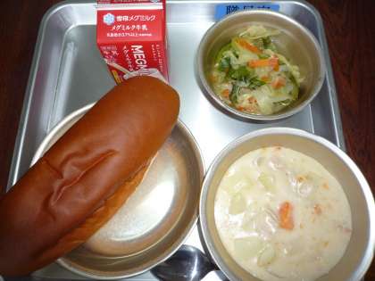 きょうの献立は「黒糖コッペパン・牛乳・じゃがいものクリームシチュー・アスパラガスのソティ」でした。クリームシチューは子どもたちに人気の献立です。寒くなってくると体を温めてくれるシチューがおいしい季節となります。学校ではバター・サラダ油・小麦粉・脱脂粉乳で手作りのルウを作っています。
