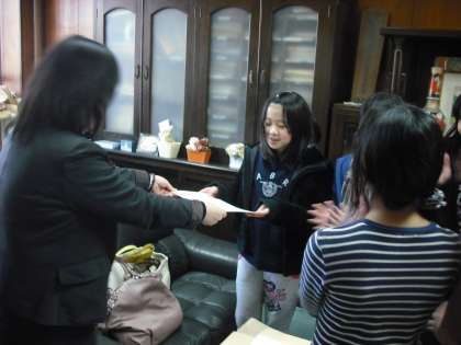 茶道部の6年生が,今まで続けてきたことの証となる「学校茶道『奨励証』」をいただきました。これからもいろいろな形で伝統文化に親しんでいって欲しいと思います。