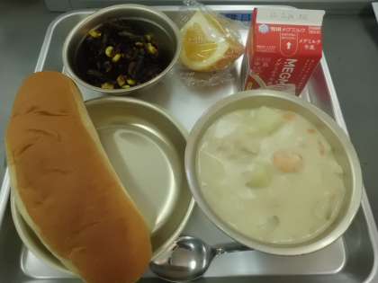 きょうの献立は「ミルクコッペパン・牛乳・えびのクリームシチュー・ひじきのソティ・はっさく」でした。クリームシチューは手作りのルウで,子どもたちの感想の中にも「とろとろしておいしかった」「とろっとしておいしかった」「クリーミーでおいしかった」とありました。優しい味がしました。はっさくは,いよかんよりも酸味があり,皮や筋のところが少し苦かったりするので,苦手な子どもも多いですが,前回よりもじょうずに食べていたように思います。