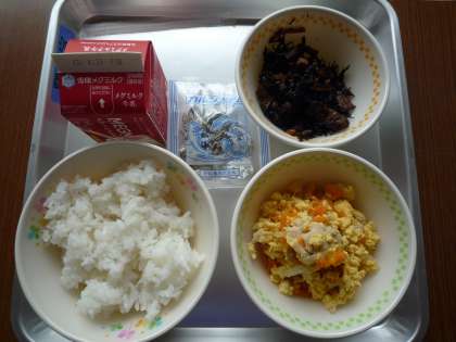 きょうの献立は「ごはん・牛乳・親子煮・ひじきのにつけ・じゃこ」でした。ひじきの煮つけは,家であまり食べない子どもも多いです。給食では大豆やひじきの献立が月に2〜3回はでてきます。成長期に大切なカルシウムや鉄という栄養素がたくさん含まれています。しっかり食べてほしい食材です。