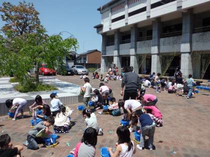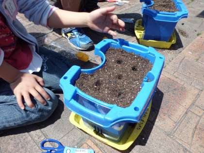 ぽかぽか陽気の下,1年生があさがおの種まきをしました。あさがおの種は,1年生の小指の爪よりもはるかに小さな種でした。「大きくなってね!」と願いを込めて植えている子もいました。はやく芽が出てきたらいいですね。
