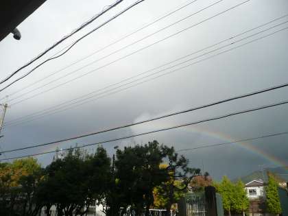 今日は,晴れたり雨が降ったりする一日でした。午後3時ごろ東の空に虹がきれいに見えました。とてもきれいにアーチ状に見えて,虹を見つけた子どもたちは大喜びでした。