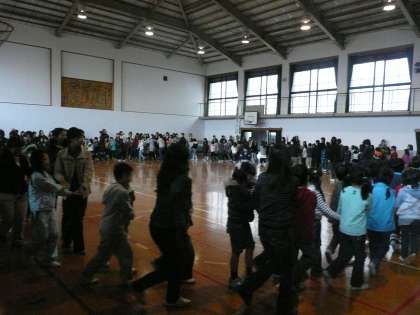 3年生は12月の支部なかよし運動会で踊る「明日があるさ」のフォークダンスを見に来てくれた2年生や4・5組,保護者のみなさんに紹介しました。そして見に来てくれた児童や保護者のみなさんにも入っていただき大きな円を作ってみんなで踊りました。とても楽しそうでした。