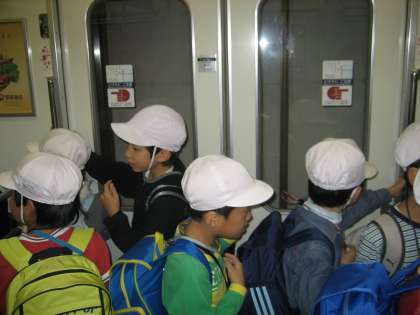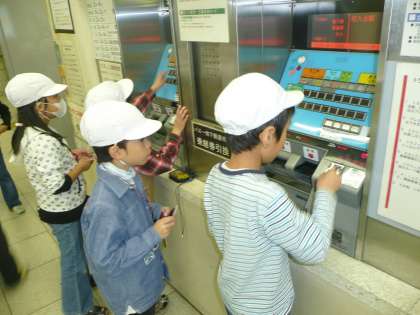 丸太町駅では,一人ひとりが用意した電車賃130円を使って乗車券を買いました。はじめて自動販売機で乗車券を購入する児童が多く,中には「どきどきする。」と言っている児童もいました。