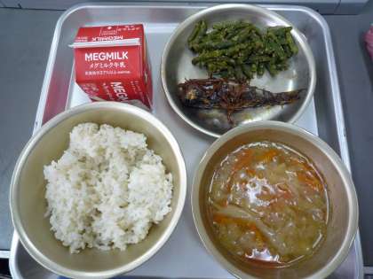 きょうの献立は「麦ごはん・牛乳・いわしのしょうが煮・三度豆のごま煮・キャベツの吉野汁」でした。いわしは,1年生も骨までしっかりかんで食べていました。苦手な子は骨をじょうずにとれないので身と骨が混じってしまって食べずらそうにしていました。キャベツの吉野汁は,鶏肉・キャベツ・にんじんをだし汁で煮て,片栗粉でとろみをつけて仕上げました。寒くなってくるとこのような汁物で体が温まりますね。