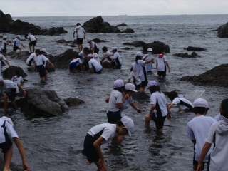 カニ ヤドカリ ナマコ 貝 エビ 小魚などを観察したりつかまえたりする事ができました。観察しながら、いつの間にか水遊び?になってしまった子供たちも。