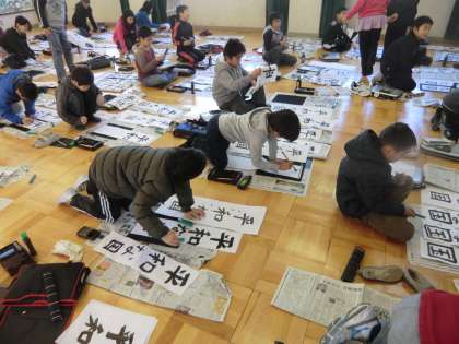 緊張した空気が流れる中,子どもたちが心を集中して,筆を運んでいました。