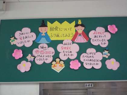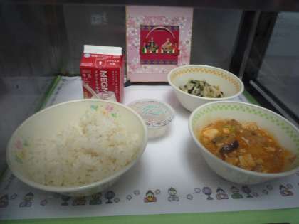 きょうの献立は「麦ごはん・牛乳・とうふの四川風・切干大根のいためナムル・りんごゼリー」でした。きょうは「ひなまつり」ですが,給食では少し早く2月26日にひなまつりのお祝い献立を実施しました。「切干大根のいためナムル」は切干大根・ほうれん草・もやしをナムルの味つけで仕上げました。歯ごたえがよく,ほどよい酸味があり,野菜がしっかり食べられました。