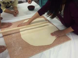 手を真っ白にして、うどん玉を伸ばし、板状に。額に汗をにじませ、力を込めて、伸ばしていきました。