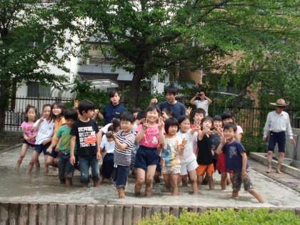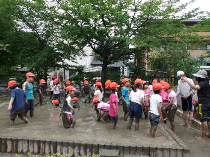 6月4日(水),地域の田んぼの先生,島田さんにお世話になって どろ田遊びをしました。初めは,田んぼの中に入ることをためらっていた子もありましたが,少し経つとどろの感触にも慣れ,おおはしゃぎで楽しんでいました。来週12日は,田植えです。
