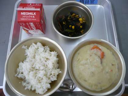 きょうの献立は「麦ごはん・牛乳・ほたてのクリームシチュー・ひじきのソティ」でした。「えっ!ごはんにクリームシチュー?」と思われるかもしれませんが,子どもたちに聞いてみると「家でも食べてる」とか「ドリアみたい」と言っていました。ごはんが週4日,パンが週1日となり,牛乳以外におかずの中での乳製品の使い方が課題になっています。