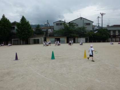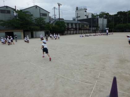 「がんばれ! がんばれ!」の声につられて運動場に出てみると1年生が体育の授業でリレー遊びをしていました。励まし合い,力いっぱいがんばっていました。最後にゴールしたチームにもみんなが健闘をたたえ,拍手をしていました。