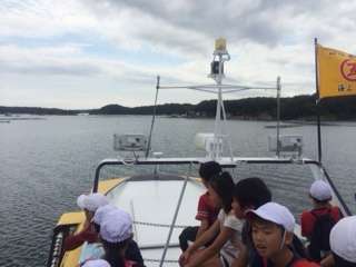 船に乗船し、みさきの家、なかよし港に向かって、穏やかな海上を進みます。リアス式海岸なので、船は、ゆったりゆったりと。