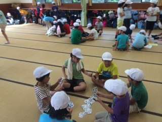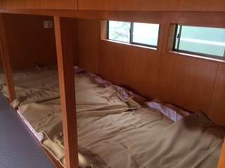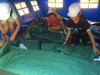 そして、寝具の準備をしました。シーツを上手に広げて、シュラフにくるんで。毛布を広げてバンガローで寝る準備をとがんばりました。