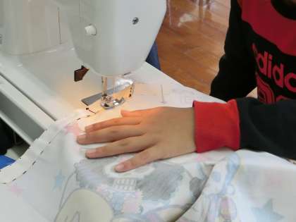 家庭科の授業で,エプロンをつくっています。