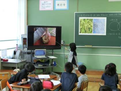 秋になり,お米が実りました。稲穂から,どのようにすれば白米にできるのか,実物や写真,画像を利用して考え合いました。