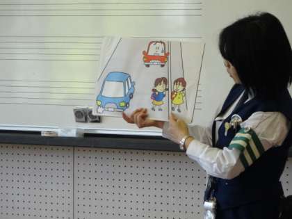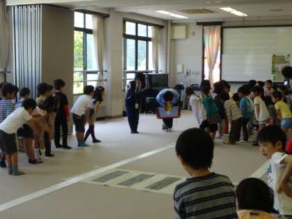 川端警察署から2名来ていただき,1年生に向けて交通安全教室が行われました。最初はイラストを見ながら,どうすれば安全を確保できるかみんなで考えました。そのあと,実際に横断歩道を渡る練習を2人でペアになってしていきました。「右・左・右」としっかり見てから渡ること,道路の右端を通ることなどがあらためて確認できました。今日学習したことを大事にして,これからも安全に過ごしてほしいです。