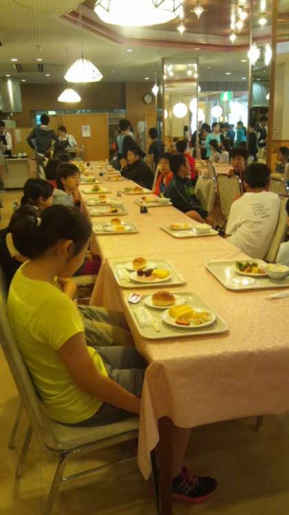 朝食バイキングの説明を聞きます。宿舎での最後の食事です。さあ2日目の始まりです!!