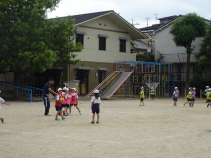 今日は気温も低く,1年生のプールは中止となってしまいましたが,運動場では2年生が元気な声を響かせながらパスゲームをしていました。チームでしっかりと声掛け合いながらシュートをねらい得点を競い合っていました。