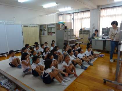 体重測定の前に保健指導がありました。まずは恒例の発声練習。「マロン! メロン! ペロン!」とリズムよくいい声が響いていました。発声練習の後は,血液のお話。血は,けがを治す力をもっていることを教えてもらいました。これからもけがをしないように安全に気をつけて過ごしたいです。