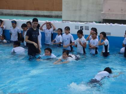 YMCAの方々4名を講師にお招きして,着衣水泳を行いました。6年生ではいつもこの時期に,水の事故から自分の身を守ることができるように,着衣水泳を行っています。服を着たままだと泳ぎにくいことを実感し,実際におぼれた時はどうしたらいいのか,実技を通して学んでいきました。ただ,水の事故にあわないことがまず第一です。自分で安全に十分気をつけた正しい判断ができるようにしたいです。YMCAの方々,熱心にご指導いただきありがとうございました。