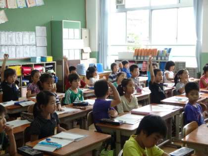 2年生では算数の時間,自分が考えたことを指し棒で指し示しながらみんなに発表していました。自分が考えたことを相手にわかりやすく伝えるというのは難しいものです。でも,みんなの前に立って一生懸命発表していました。それを聞くクラスのみんなも友だちが何を伝えようとしているのか一生懸命に聞いていました。これからもいろいろな学習で互いに学び合うことができたらいいですね。