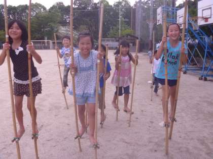 夕方,元気な声が聞こえているなあと運動場を見ると,児童館のみんなが竹馬の練習です。うまく乗りこなすだけでなく音楽に合わせてのっています。すごーい。