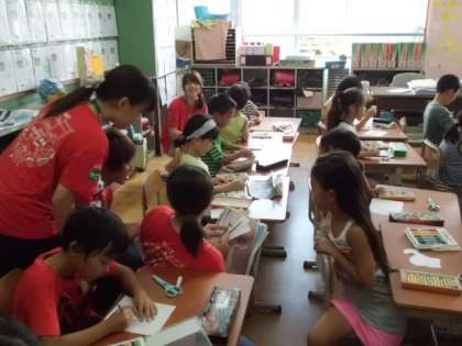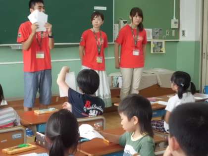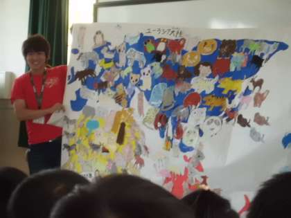 たくさんの学生に来ていただいて,2年生が学生祭典で出される絵を一緒に描きました。いろいろな動物や国旗に色を塗り,それを学生たちが用意した世界地図に貼っていきました。活動を通して,世界にはいろいろな国があること,そして,動物も含めたくさんの生きものが生活していることが分かりました。自分たちが作った作品が飾られるのがとても楽しみです。