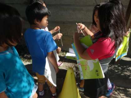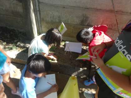 運動場に出て日なたと日かげの地面の温度のちがいを,温度計を使って調べました。今日はとても天気の良い一日。日なたと日かげでだいぶ温度にちがいがあったのではないでしょうか。またこれから続く実験・観察も正確に調べていくことができるといいですね。