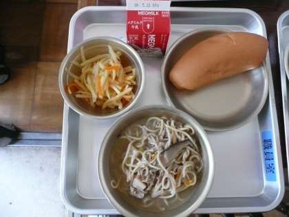 今日の給食は,牛乳,じゃがいものピリカラいため,かくチーズ,こがたコッペパン,チャンポンです。