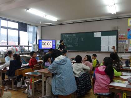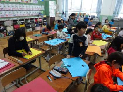 毎年恒例となっている京都大学留学生との交流がありました。各クラスに入って,日本の小学校の子どもたちの学習する様子,生活する様子を,一緒に体験してもらいながら学んでもらいました。子どもたちも毎年楽しみにしています。最初は戸惑いながらも,少しずつ打ち解けていく様子が見られました。