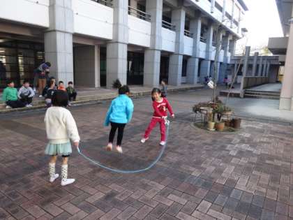 学校が始まるとともに,急に寒い毎日が続くようになりましたが,でも,みんな寒さに負けず外で遊ぶ姿が見られます。中庭では1年生がなわとびで遊んでいました。体育の時間に挑戦した技を跳んでみたり,自分オリジナルの跳び方をしてみたりと,思い思いになわとびを楽しんでいました。高学年と一緒に楽しそうにおおなわをしている人もいました。また,いろいろな跳び方ができるようになったら教えてくださいね。