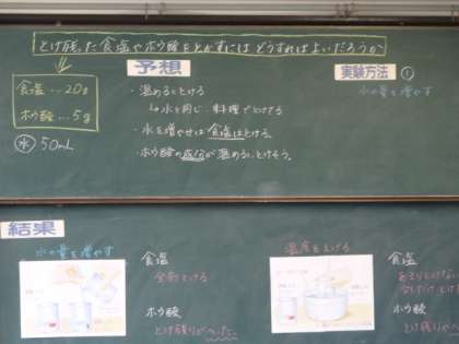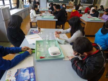 「もののとけ方」を理科室で学習です。今回は,『とけ残った食塩やホウ酸をとかすにはどうしたらいいか』ということを実験を通して調べ確認していきました。5年生にもなると実験も複雑になってきますが,安全に気をつけながら班で協力して実験を進めていました。ノートもしっかりとまとめることができていて,集中して学習に取り組むことができているなと感心しました。