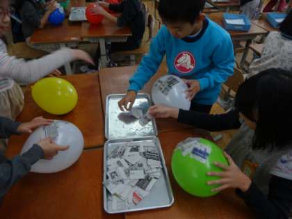 張り子のお麺づくりに取り組みます。膨らませた風船に新聞紙を重ねて貼る作業をしました。隙間を埋めるように丁寧に一枚一枚貼り重ねていきました。この後,和紙を貼り,色を塗って仕上げていきます。出来上がった作品は2月24日・25日の作品展で展示予定ですので,楽しみにしていてください。