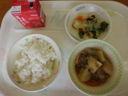 献立は,胚芽米ごはん・牛乳・牛肉と野菜の煮つけ・てっぱいでした。