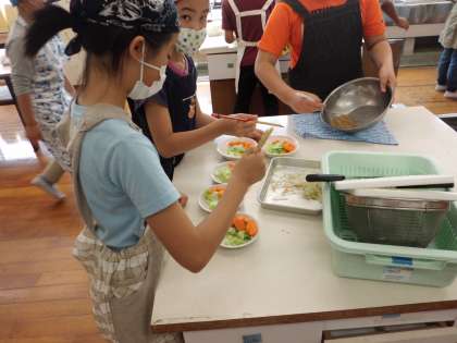 家庭科室からいい匂いがしてきたので覗いてみたら5年生が調理実習に挑戦していました。ゆでたおいしそうな野菜にこれまたいいかおりのドレッシング!その場にいるだけで